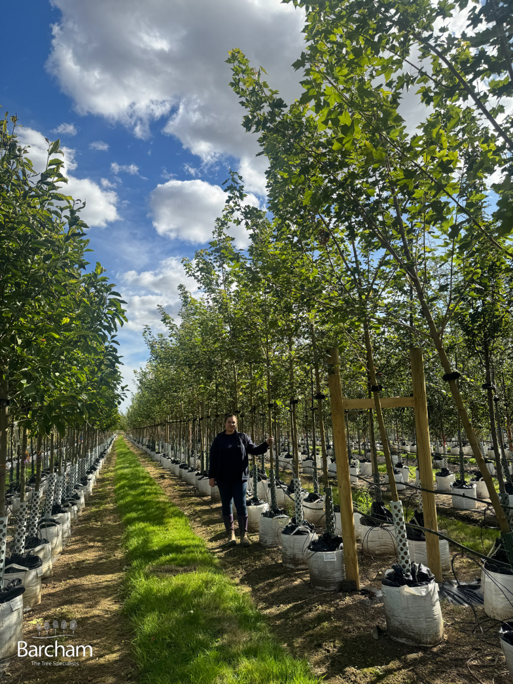 Row of medium-size Acer platanoides Pacific Sunset Maple trees at Barcham Trees nursery -
