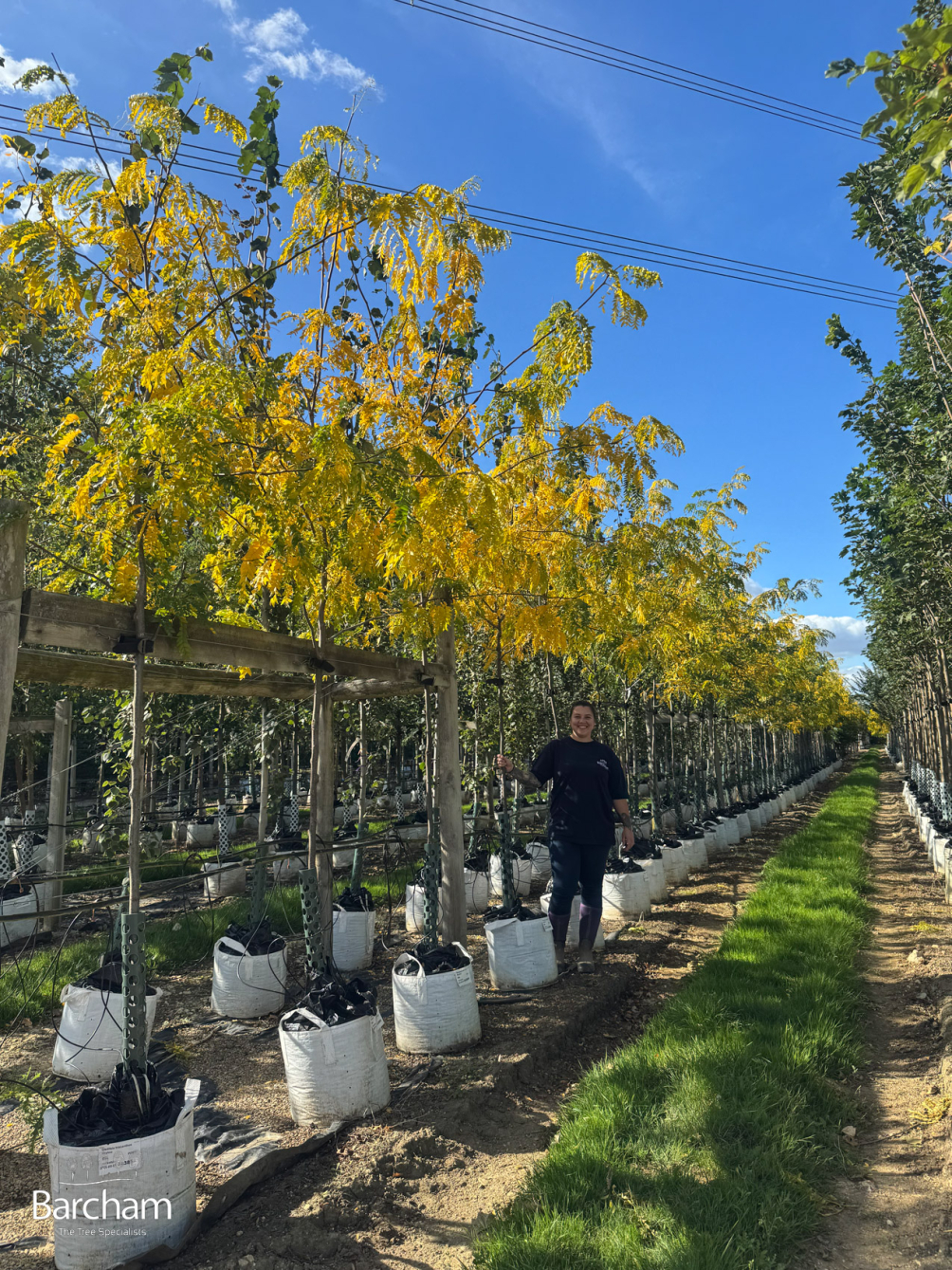Gleditsia triacanthos Skyline, known as the Honey Locust, is a very pretty tree with soft feathery foliage that turns a magnificent deep yellow in the autumn.